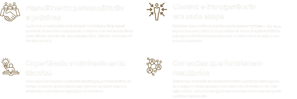 Unimos técnica, empatia e estratégia para transformar desafios jurídicos em conquistas reais. Nossa atuação é pautada pela ética, transparência e constante atualização profissional, garantindo que cada cliente receba um serviço de excelência e segurança jurídica em todas as etapas.